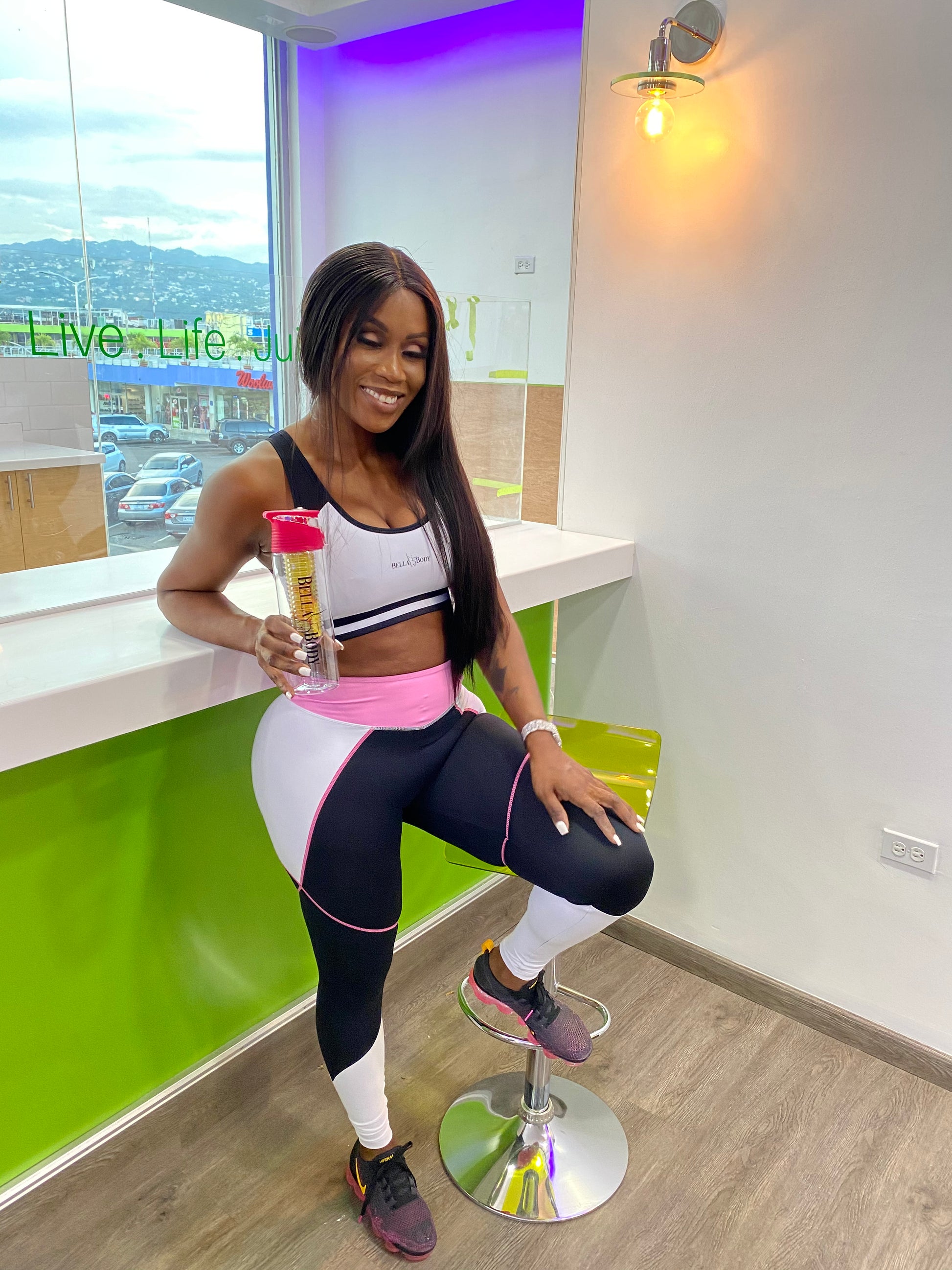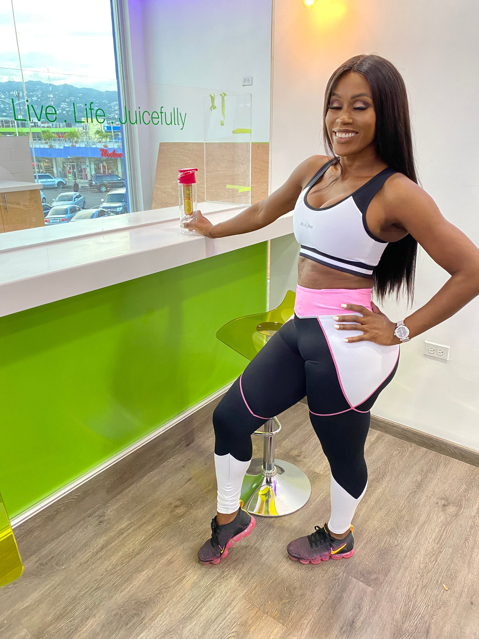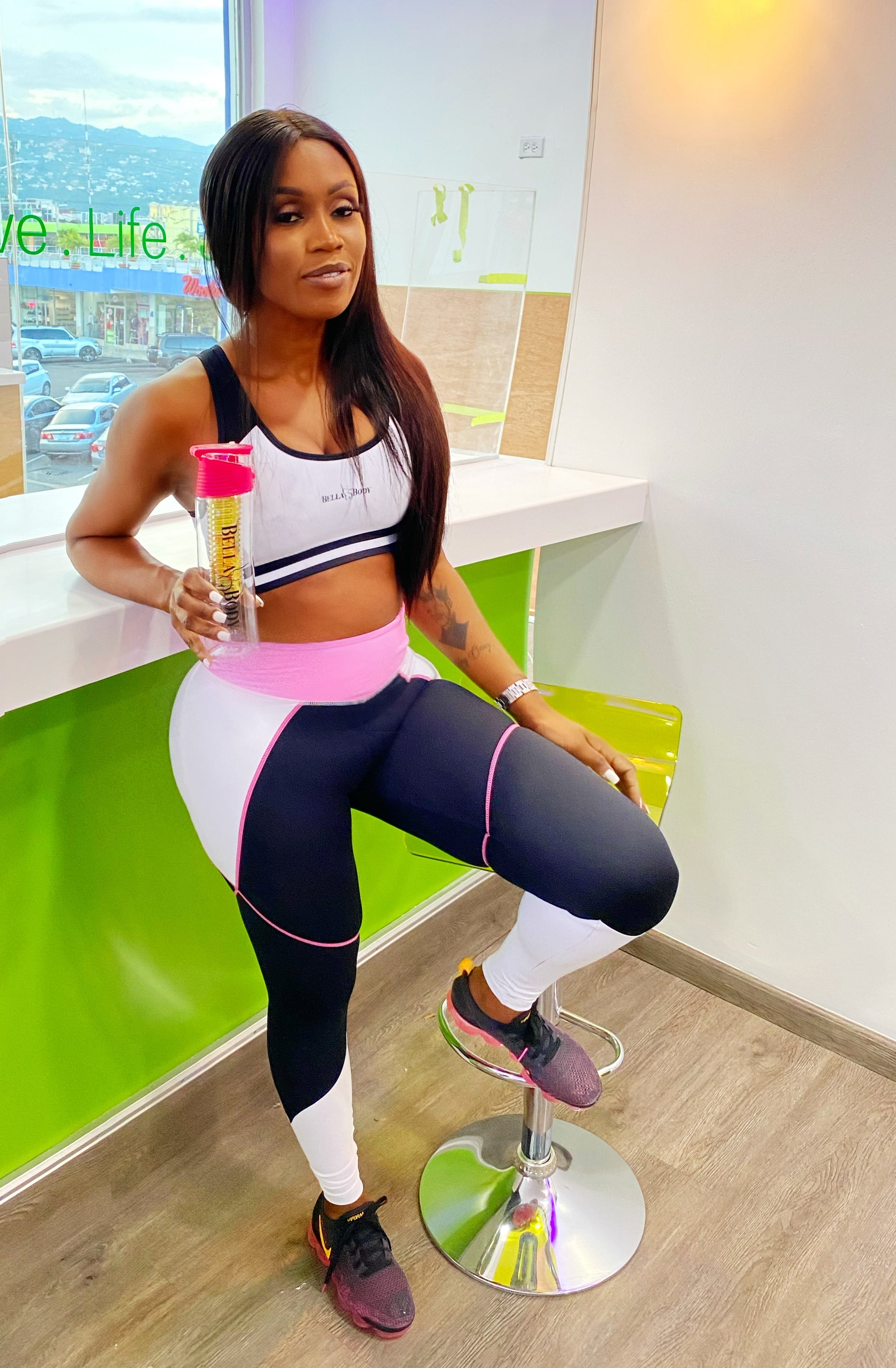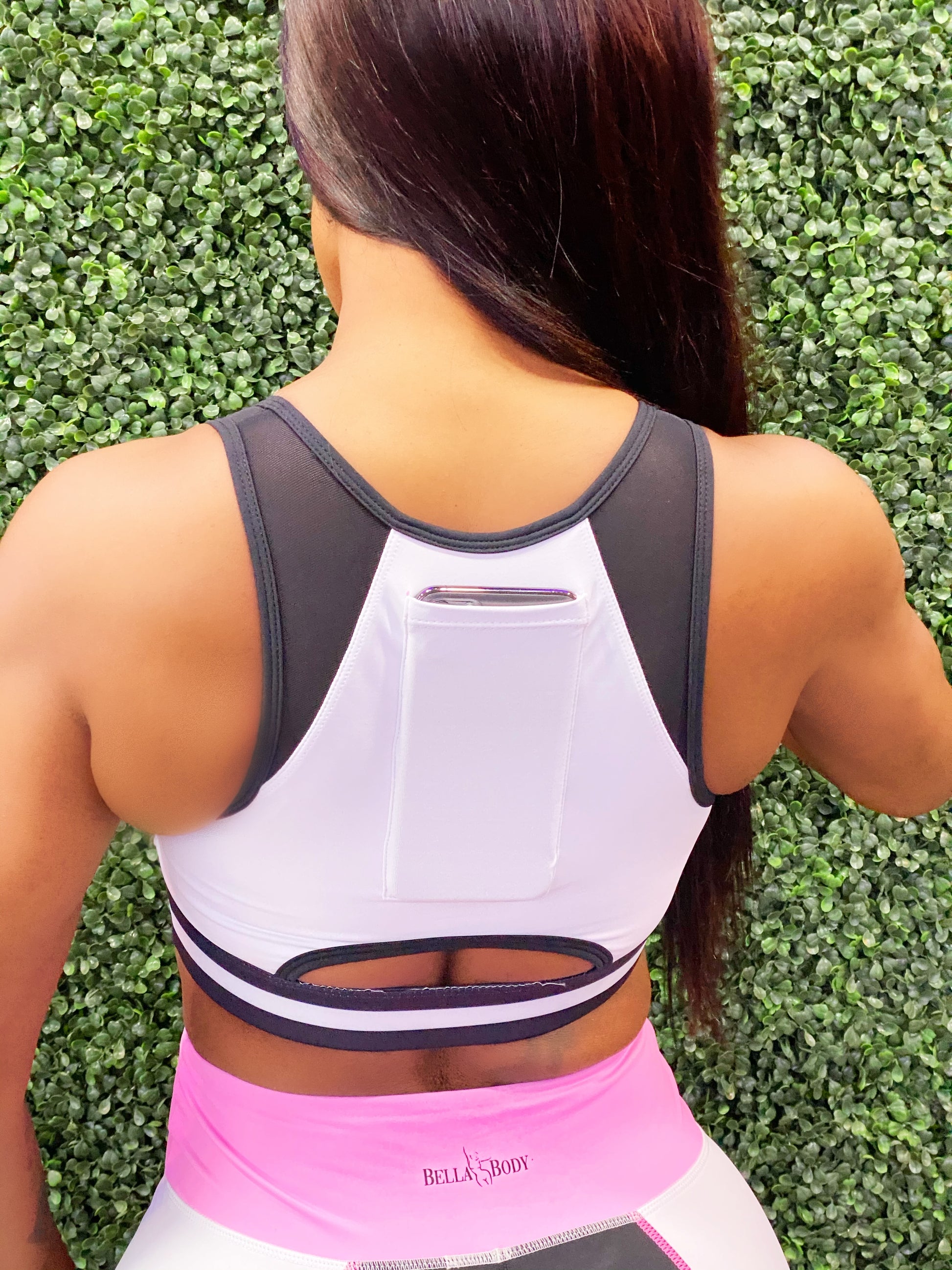 BellaBODY black, pink and white set with contrasting panels. This Sports Bra and Legging Set is an eye turner.