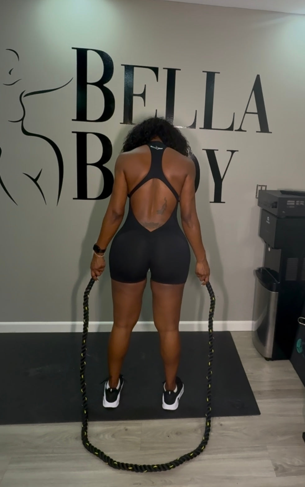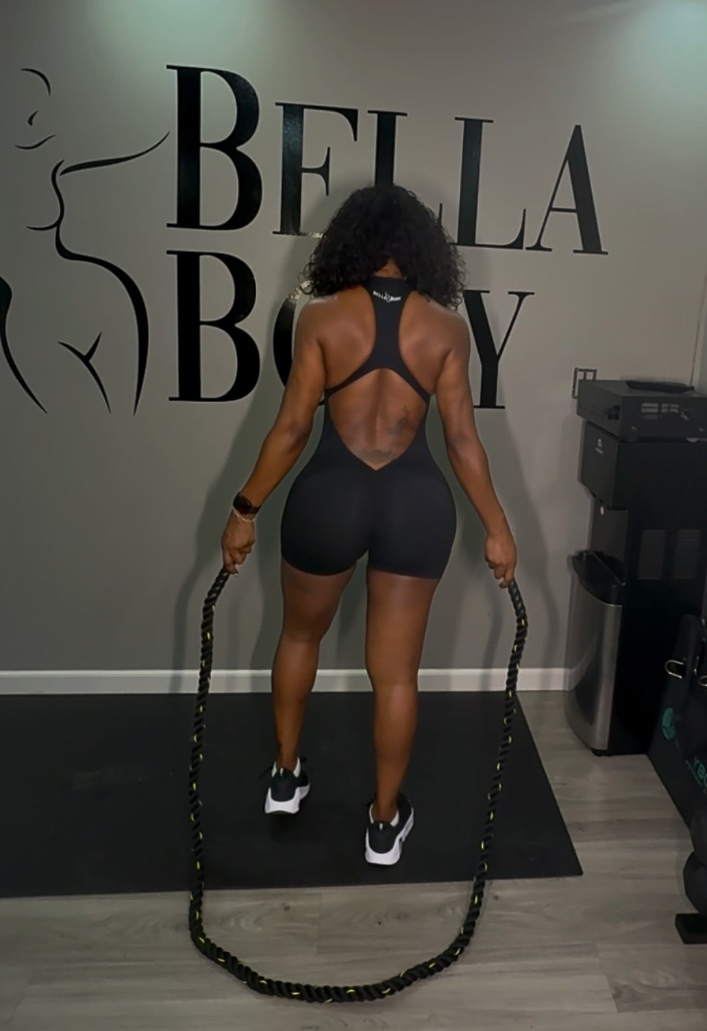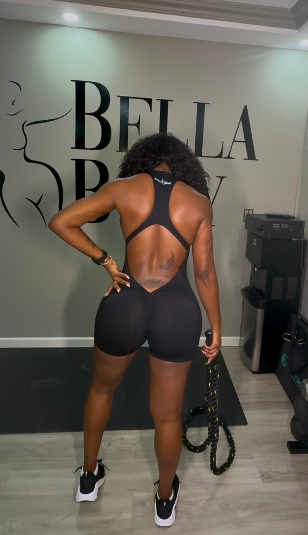 BellaBODY “Megan” jumpsuit with cut out race back details and 4 way stretch! Colors available: black, red, blue