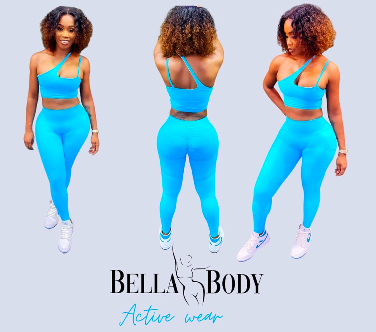 BellaBODY “Sky” Sports Bra and full Legging with ruching on your peach.... making this set an eye turner. Pick either the sky blue or army green, either will surely compliments your skin tones.